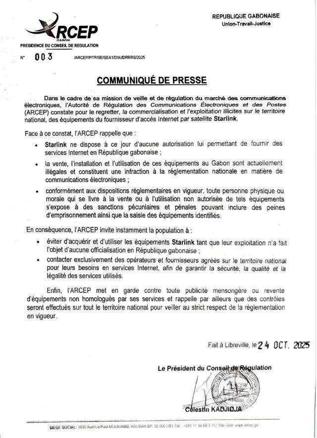 关于加蓬有关部门通告禁止使用星链设备的星链领事提醒
